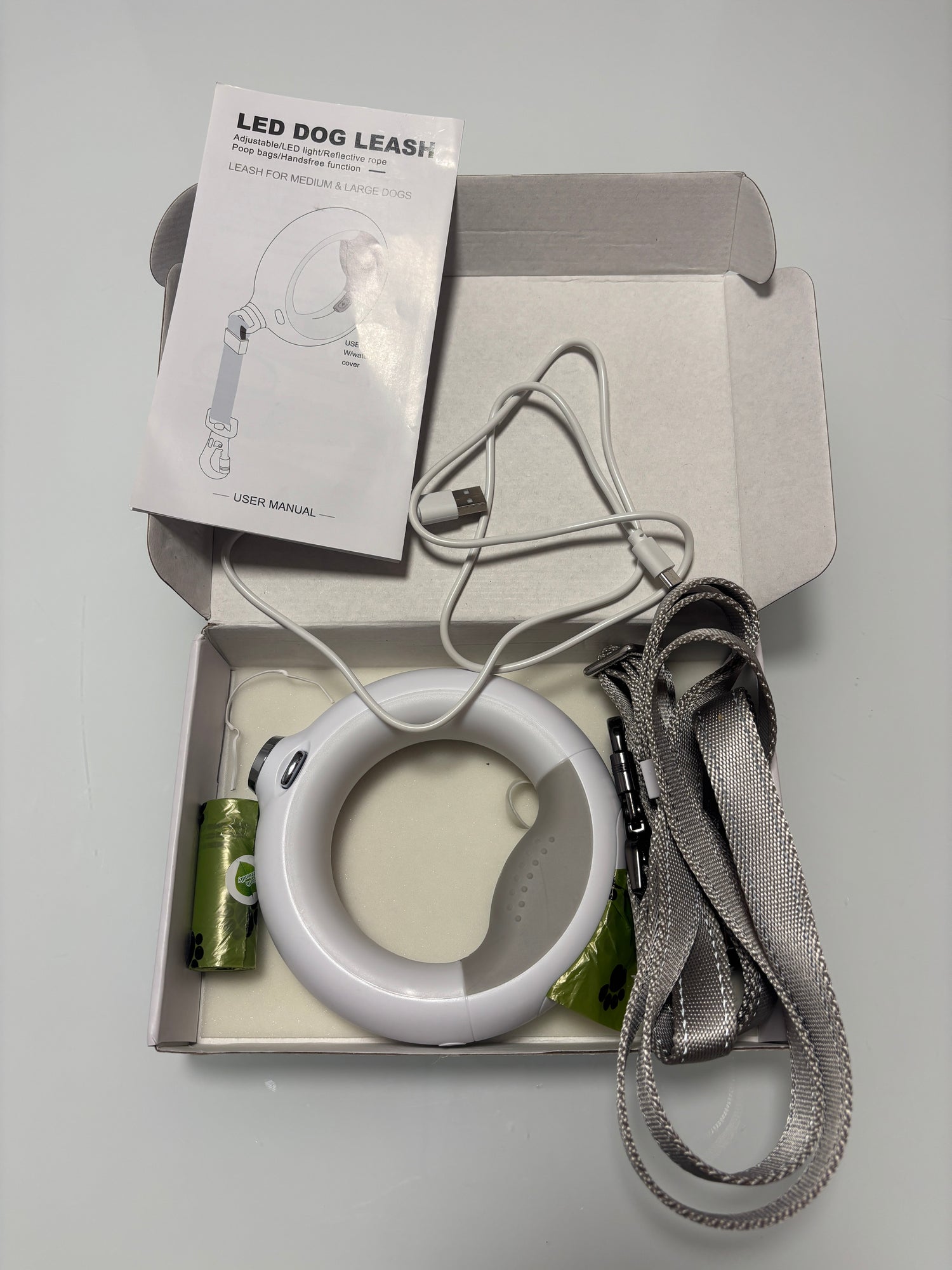 Nuestra correa con compartimento para bolsas de excremento y luz LED integrada está diseñada para dueños de mascotas que valoran la comodidad, la funcionalidad y la seguridad en cada paseo.